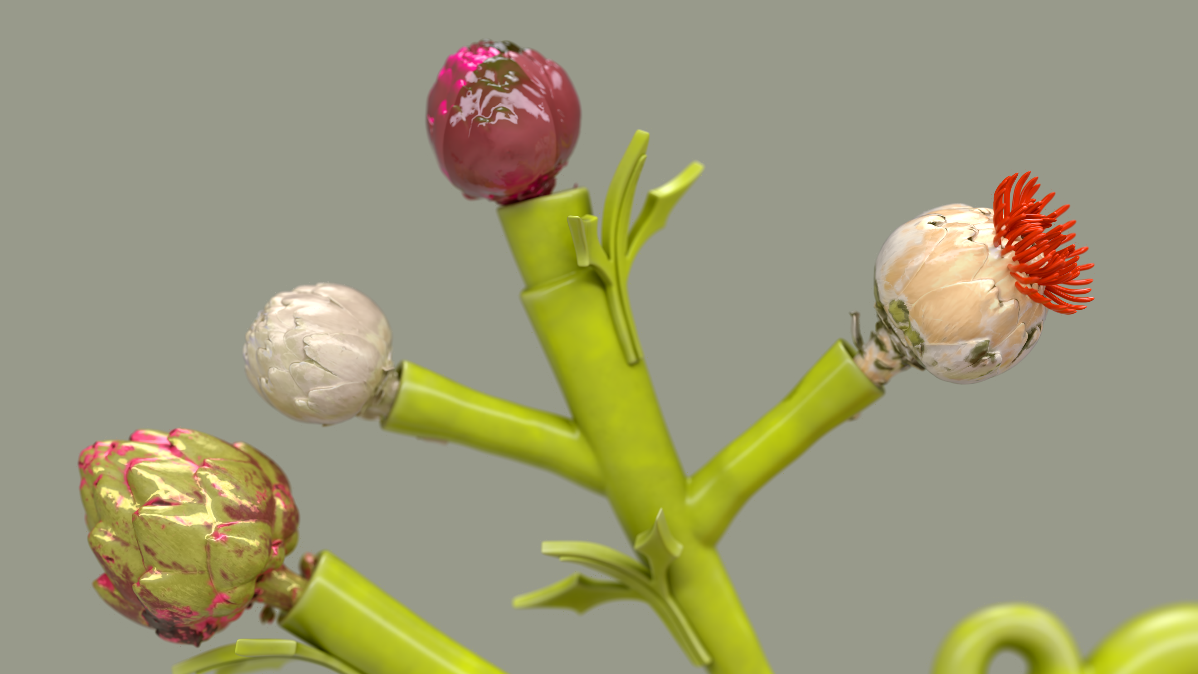 Here is a little breakdown of how the scanned artichoke looked initially and the second and third iteration with Stylization filter and Color Variation in Sampler