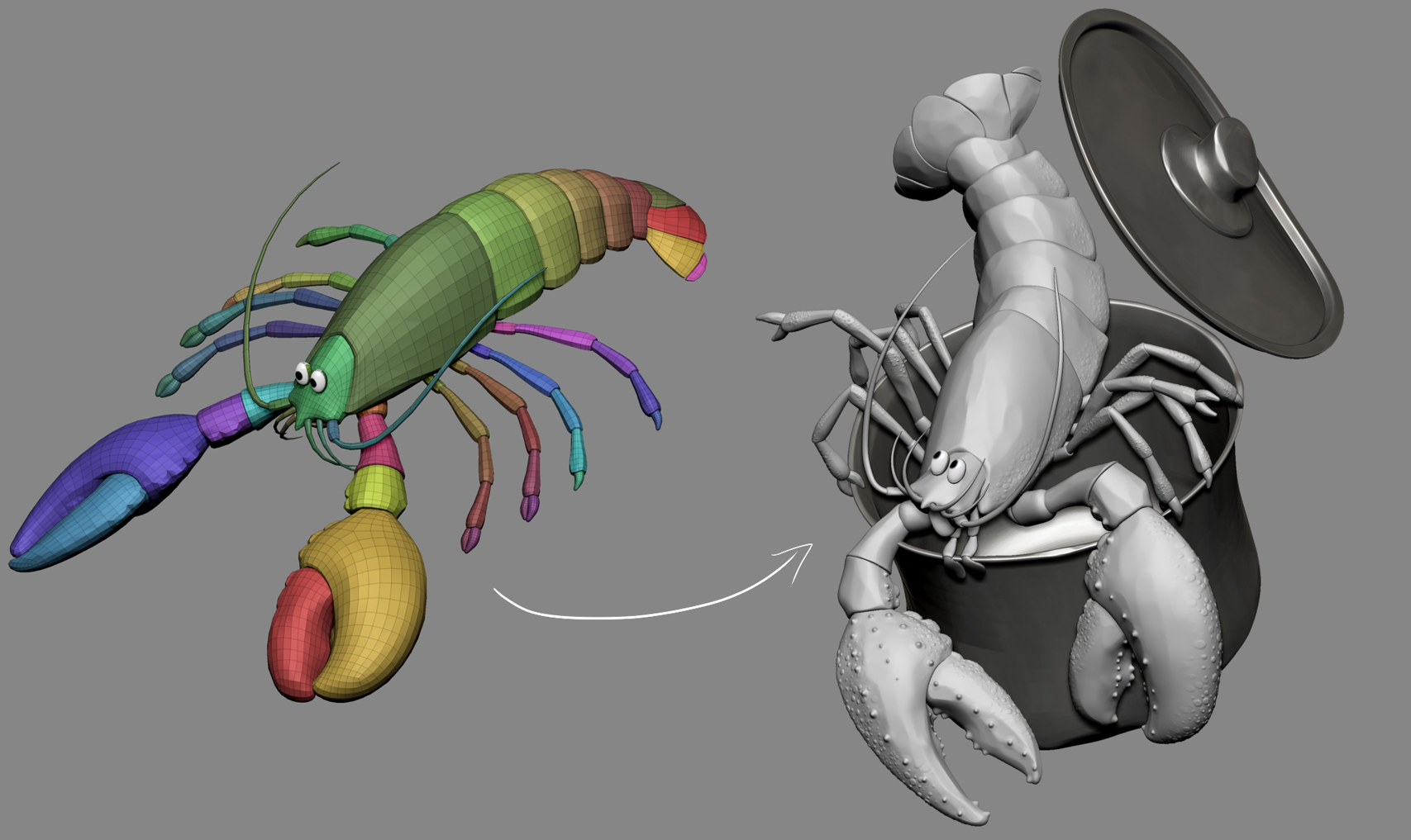 Once the model was ready, I sent the scene to Charles, who posed the lobster according to the camera angle I had set up. He returned the posed model to me, and I integrated it back into the scene.
