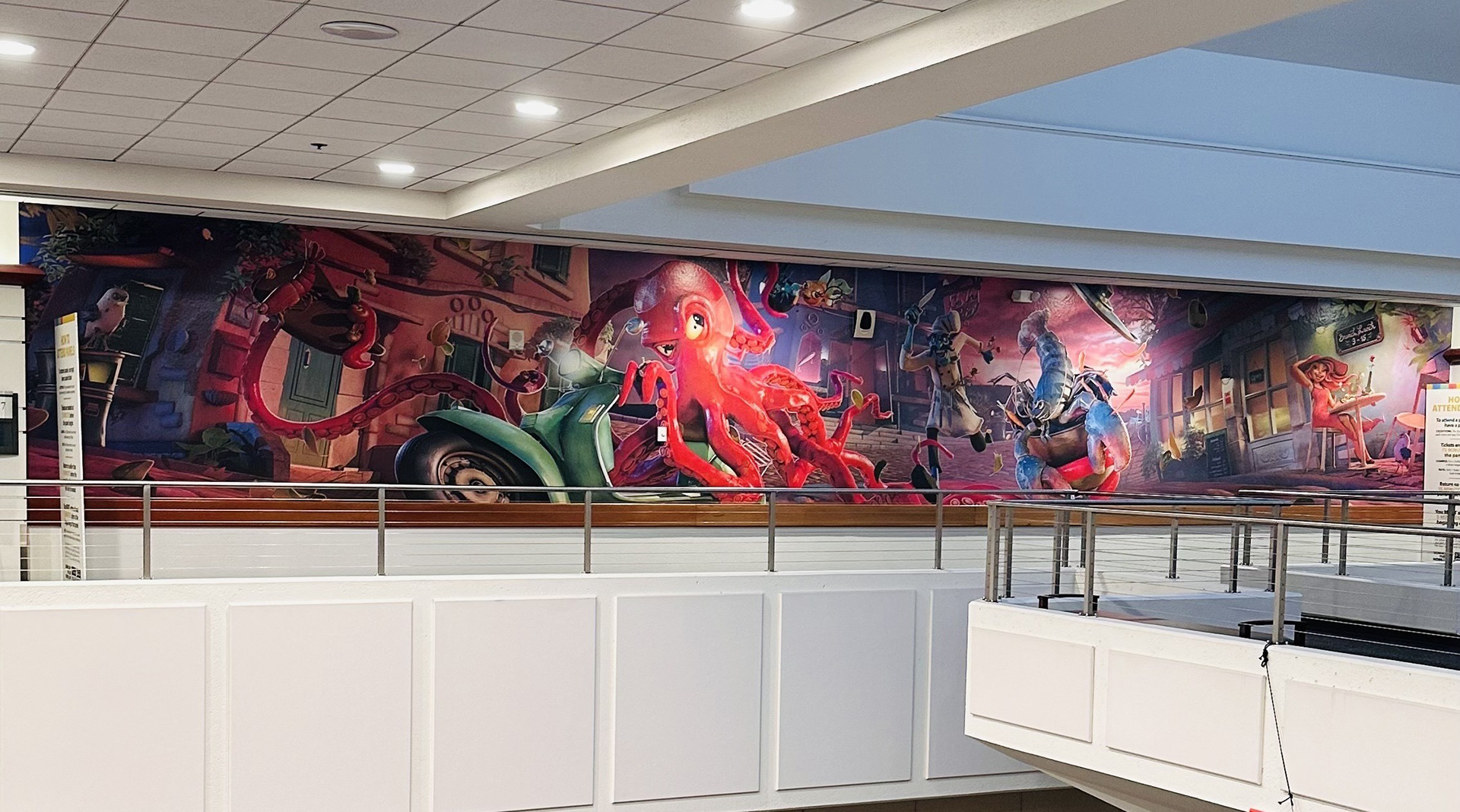 I returned to this idea when we began discussing the creation of the mural for LightBox Expo. The octopus struck me as a perfect centerpiece—not just for its visual appeal but because its eight tentacles allowed for multiple stories to unfold simultaneously. Each tentacle could become a stage for different characters and actions. The concept evolved into a daring narrative: an octopus heroically saving his friends from becoming someone’s dinner.