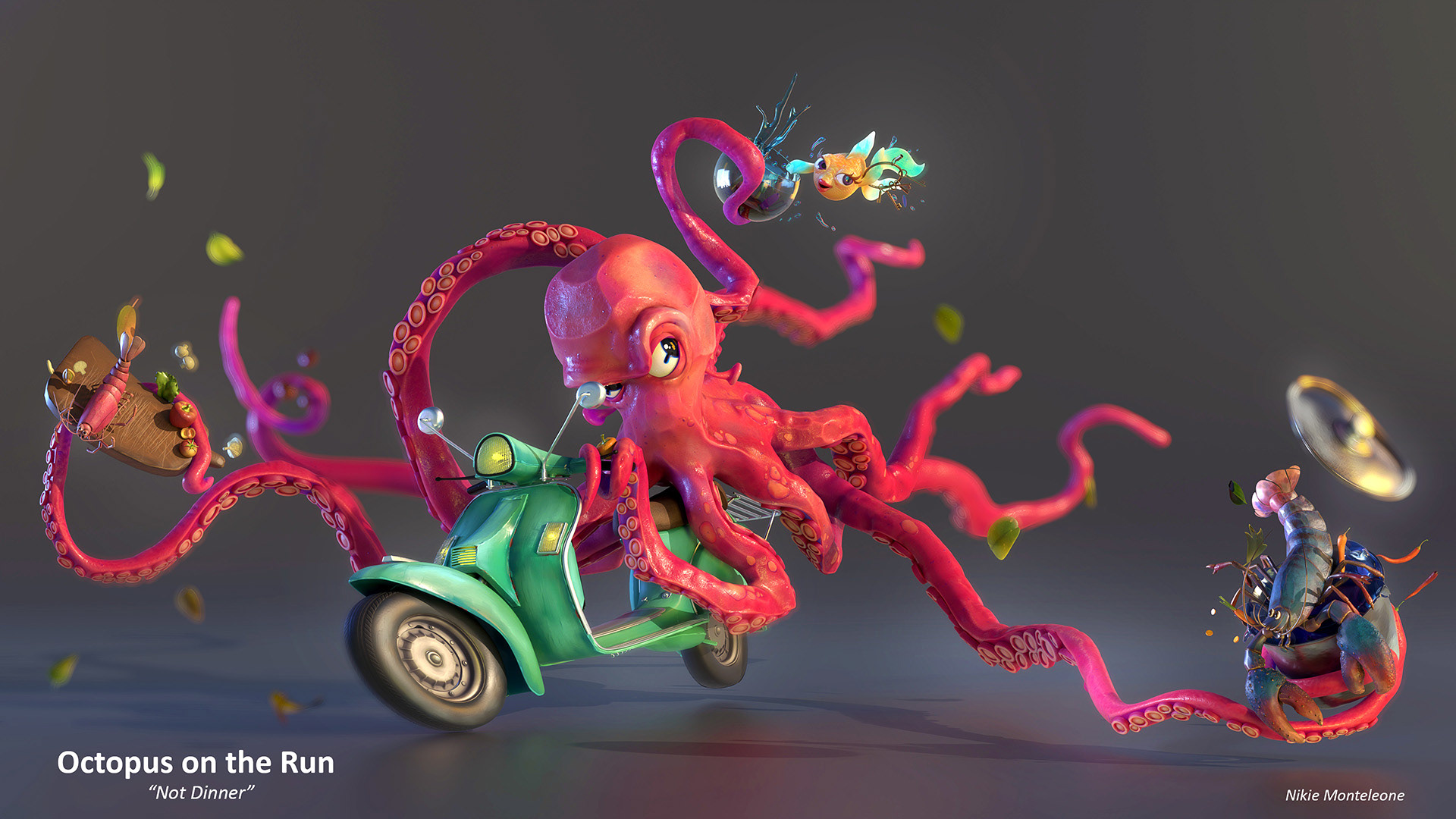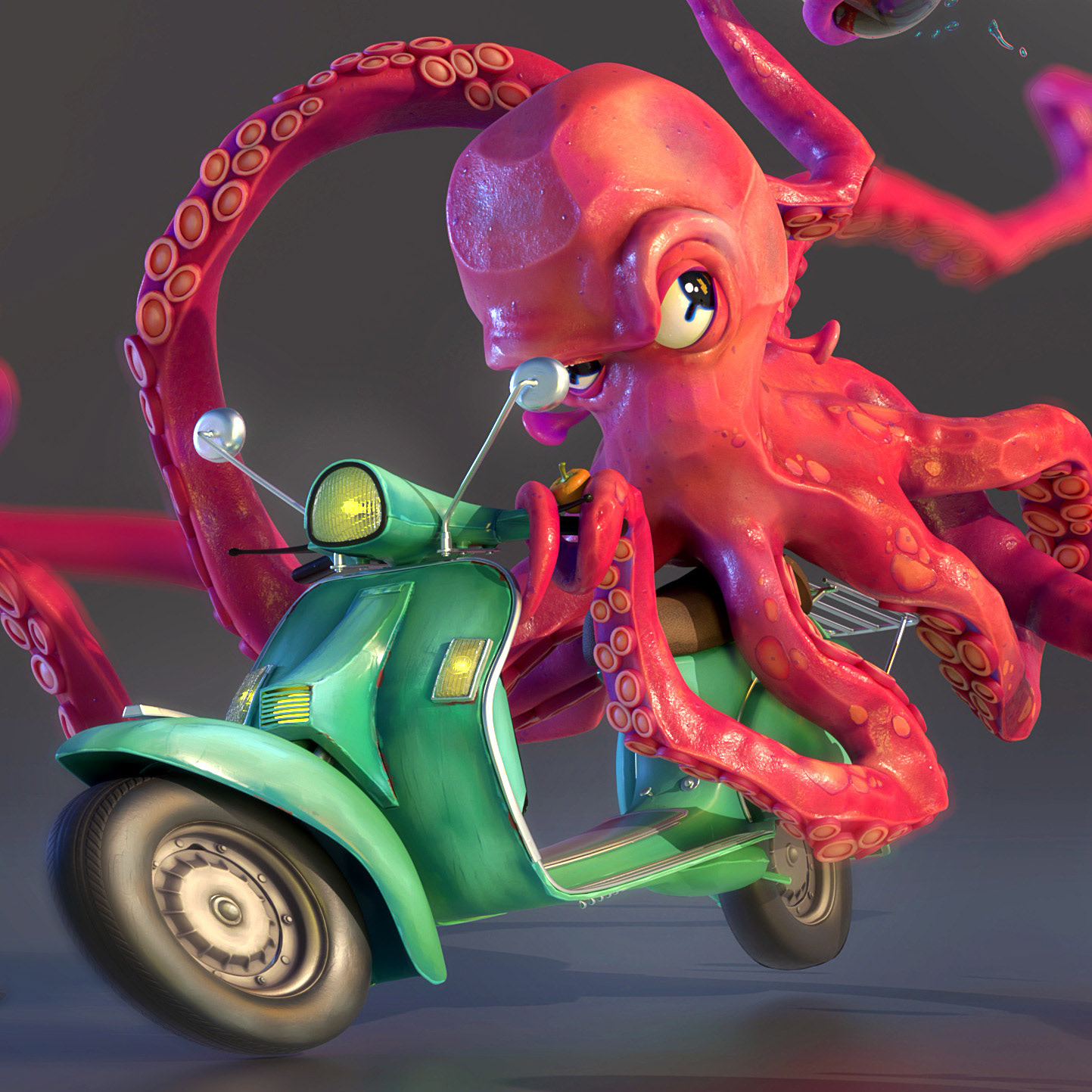 Moreover, to mark the occasion of this deep dive into Not Dinner, we’re releasing two of the models from this project on Substance 3D Assets—the scooter on which our heroic cephalopod makes its daring escape, and Charles Ellison’s lobster model. Go to Substance 3D Assets to download the vehicle and the crafty crustacean right now.