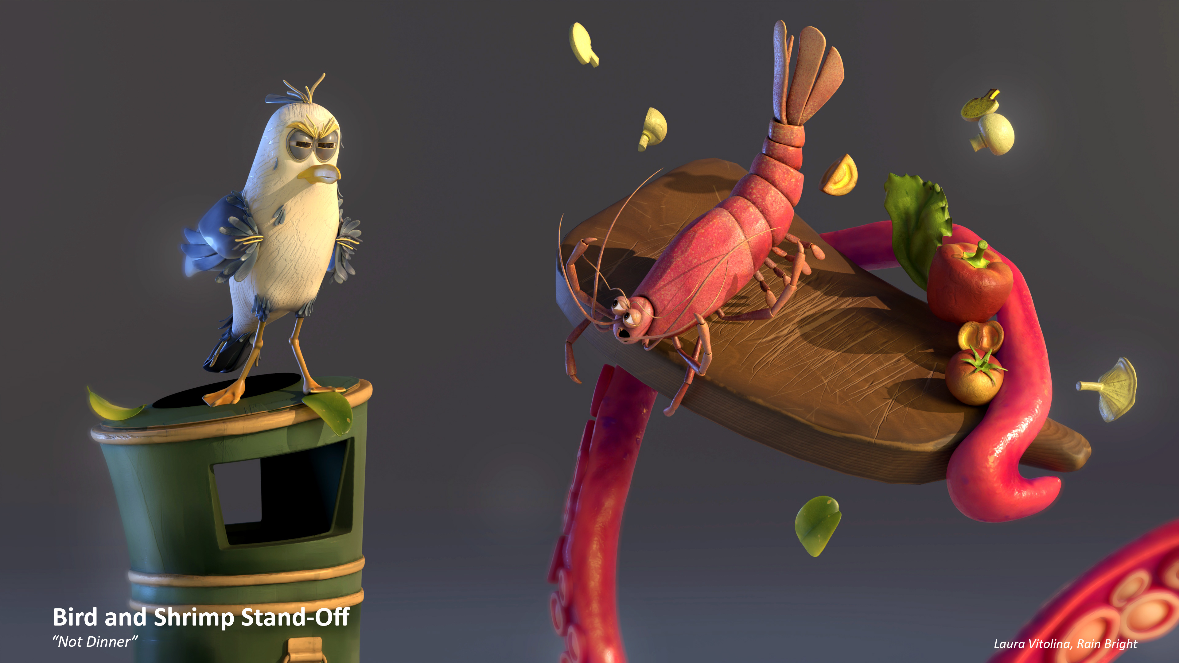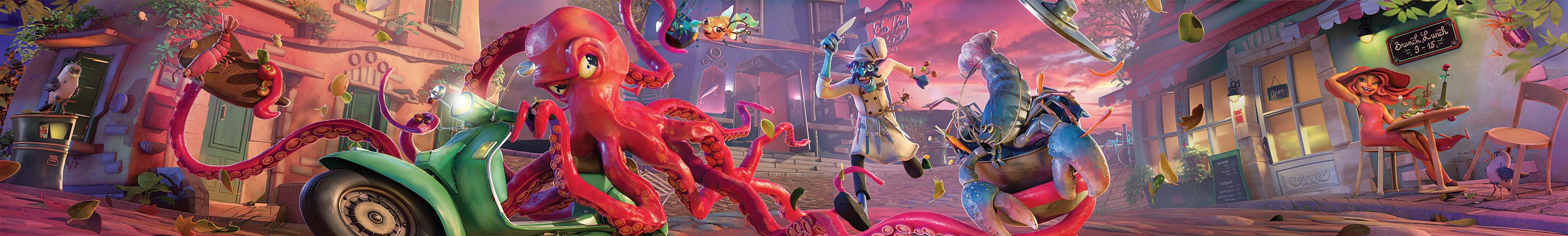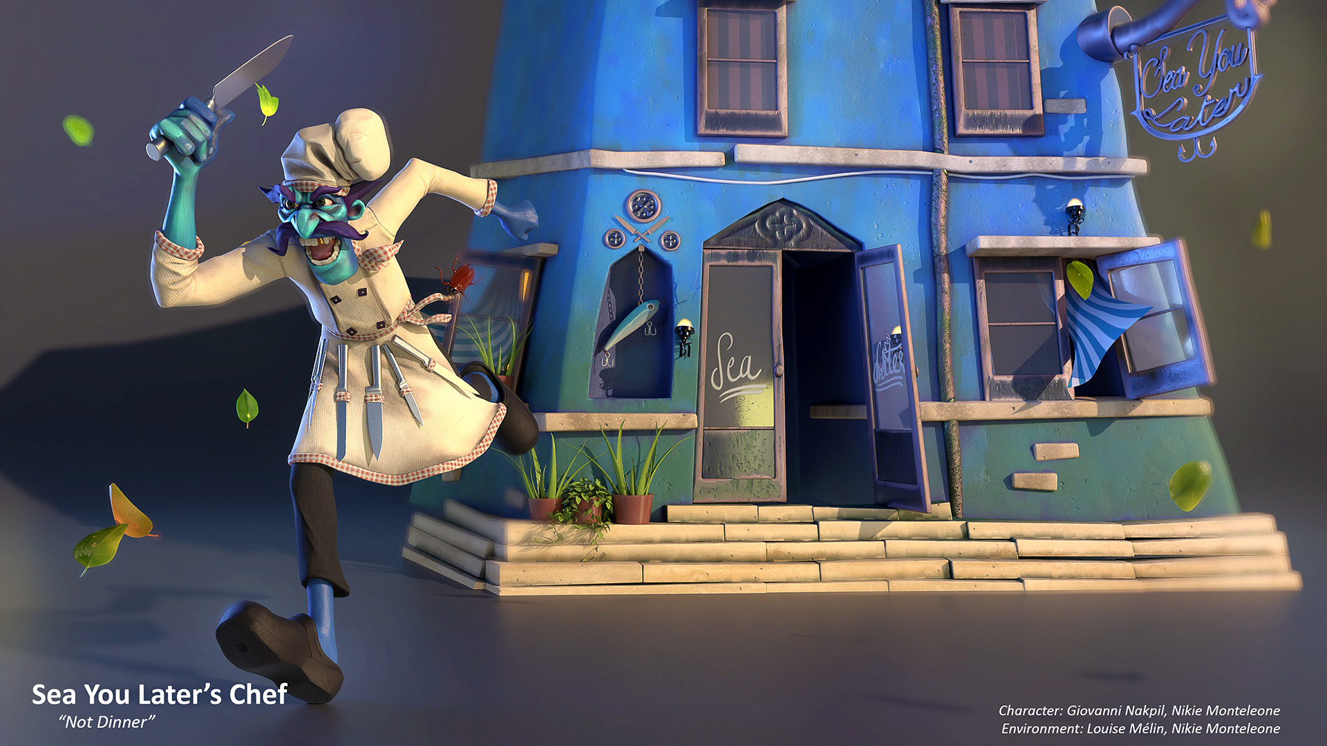 I assembled an incredible team to help bring this vision to life. Laura Vitolina worked on elements like the bird, and the shrimp and the cutting board. Giovanni Nakpil modeled the evil chef and the female character we affectionately called Ms Cherry Tomato. Louise Melin handled a lot of the environmental design, from the painterly details to a lot of the small details and Easter eggs hidden throughout the mural, like the octopus motif on the door. Charles Ellison is well known as a fantastic artist and educator; he created the lobster. Rain Bright contributed the fish design and did some modeling. Rain was a student at the time, and ultimately had to skip the presentation of the mural at LightBox in favor of a graduation ceremony but we were stoked to be able to work with them, this early in their career. And I focused on the octopus, parts of the environment like the moped, and the buildings in the background.